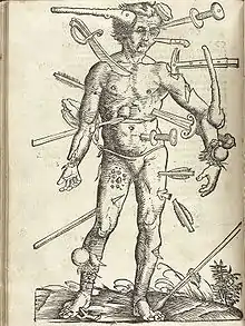 An illustration of the Wound Man, showing a variety of wounds from the Feldbuch der Wundarznei (Field manual for the treatment of wounds) by Hans von Gersdorff, (1517); illustration by Hans Wechtlin.