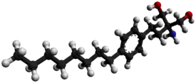 Fingolimod, sold under the brand name Gilenya, is an immunomodulating medication, mostly used for treating multiple sclerosis (MS).[2] Fingolimod is a sphingosine-1-phosphate receptor modulator, which sequesters lymphocytes in lymph nodes, preventing them from contributing to an autoimmune reaction. It has been reported to reduce the rate of relapses in relapsing-remitting multiple sclerosis by approximately one-half over a two-year period.[3]