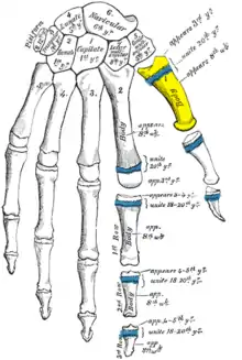 The first metacarpal bone or the metacarpal bone of the thumb is the first bone proximal to the thumb. It is connected to the trapezium of the carpus at the first carpometacarpal joint and to the proximal thumb phalanx at the first metacarpophalangeal joint.