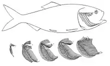 The gills are composed of comb-like filaments, the gill lamellae, which help increase their surface area for oxygen exchange.[6] When a fish breathes, it draws in a mouthful of water at regular intervals. Then it draws the sides of its throat together, forcing the water through the gill openings, so that it passes over the gills to the outside. The bony fish have three pairs of arches, cartilaginous fish have five to seven pairs, while the primitive jawless fish have seven. The vertebrate ancestor no doubt had more arches, as some of their chordate relatives have more than 50 pairs of gills.[7]