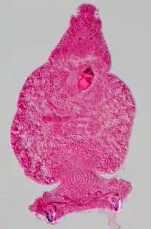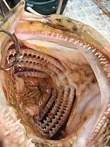Fish gills are the preferred habitat of many ectoparasites (parasites attached to the gill but living out of it); the most commons are monogeneans and certain groups of parasitic copepods, which can be extremely numerous.[17] Other ectoparasites found on gills are leeches and, in seawater, larvae of gnathiid isopods.[18] Endoparasites (parasites living inside the gills) include encysted adult didymozoid trematodes,[19] a few trichosomoidid nematodes of the genus Huffmanela, including Huffmanela ossicola which lives within the gill bone,[20] and the encysted parasitic turbellarian Paravortex.[21] Various protists and Myxosporea are also parasitic on gills, where they form cysts.
