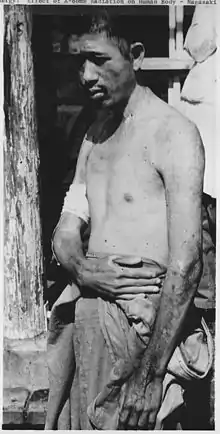 A man who was present at Nagasaki on August 9, 1945, during the dropping of the 20 kiloton Fat Man bomb, this photo displays that 1st and 2nd degree burn injuries he experienced on his unclothed skin, the shoulder and arm, while the thin vest garment of clothing that he was wearing at the time of the explosion completely protected his stomach and lower chest from experiencing similar burns. A clearer color restored version of this picture is also available.[3]