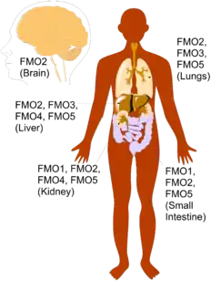 Expression of each type of FMO relies on several factors including, cofactor supply, physiological & environmental factors, as well as diet. Because of these factors, each type of FMO is expressed differently depending on the species and tissue.[30] In humans, expression of FMO's is mainly concentrated to the human liver, lungs, and kidneys, where most of the metabolism of xenobiotics occur. However, FMO's can also be found in the human brain and small intestine. While FMO1-5 can be found in the brain, liver, kidneys, lungs, and small intestine, the distribution of each type of FMO differs depending on the tissue and the developmental stage of the person.[14]