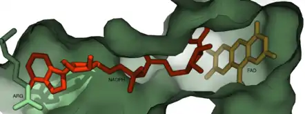FMOs have a tightly bound FAD prosthetic group and a binding NADPH cofactor.[11] Both dinucleotide binding motifs form Rossmann folds. The yeast FMO and bacterial FMO are dimers, with each monomer consisting of two structural domains: the smaller NADPH binding domain and the larger FAD-binding domain. The two domains are connected by a double linker. A channel between the two domains leads to the active site where NADPH binds both domains and occupies a cleft that blocks access to the flavin group of FAD, which is bound to the large domain along the channel together with a water molecule.[1][22] The nicotinamide group of NADPH interacts with the flavin group of FAD, and the NADPH binding site overlaps with the substrate binding site on the flavin group.[1]