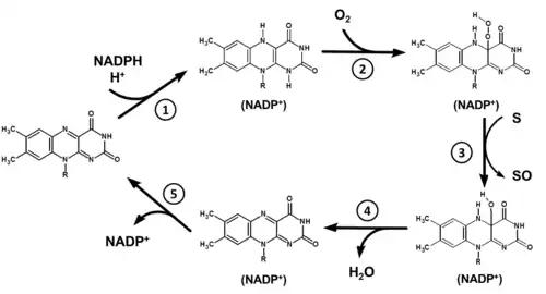 5. Due to the low dissociation constant of the NADP+-enzyme complex,[28] NADP+ is released by the end of the cycle and the enzyme returns to its original state. The rate-limiting step involves either the breakdown of FADH-OH to water or the release of NADP+.[3][4]