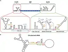 The 5'UTRs are 95–101 nucleotides long in Dengue virus.[14] There are two conserved structural elements in the Flavivirus 5'UTR, a large stem loop (SLA) and a short stem loop (SLB). SLA folds into a Y-shaped structure with a side stem loop and a small top loop.[14][15] SLA is likely to act as a promoter, and is essential for viral RNA synthesis.[16][17] SLB is involved in interactions between the 5'UTR and 3'UTR which result in the cyclisation of the viral RNA, which is essential for viral replication.[18]