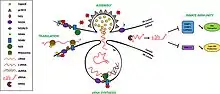 Subgenomic flavivirus RNA (sfRNA) is an extension of the 3' UTR and has been demonstrated to play a role in flavivirus replication and pathogenesis.[25] sfRNA is produced by incomplete degradation of genomic viral RNA by the host cells 5'-3' exoribonuclease 1 (XRN1).[26] As the XRN1 degrades viral RNA, it stalls at stemloops formed by the secondary structure of the 5' and 3' UTR.[27] This pause results in an undigested fragment of genome RNA known as sfRNA. sfRNA influences the life cycle of the flavivirus in a concentration dependent manner. Accumulation of sfRNA causes (1) antagonization of the cell's innate immune response, thus decreasing host defense against the virus[28] (2) inhibition of XRN1 and Dicer activity to modify RNAi pathways that destroy viral RNA[29] (3) modification of the viral replication complex to increase viral reproduction.[30] Overall, sfRNA is implied in multiple pathways that compromise host defenses and promote infection by flaviviruses.