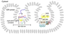 Flavivirus genomic RNA replication occurs on rough endoplasmic reticulum membranes in membranous compartments. New viral particles are subsequently assembled. This occurs during the budding process which is also responsible for the accumulation of the envelope and cell lysis.