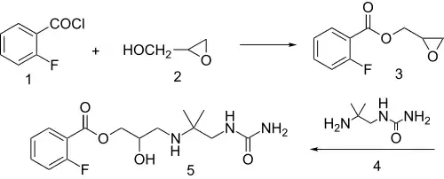 Acylation of glycidol (2) with the acid chloride 1 produces the ester 3. Reaction of that intermediate with amine 4, obtained by reaction of 1,1-dimethylethylenediamine with urea, gives flestolol (5).