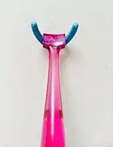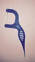 In 1888, B.T. Mason wrapped a fibrous material around a toothpick and dubbed it the "combination tooth pick."[39] In 1916, J.P. De L'eau invented a dental floss holder between two vertical poles.[40] In 1935, F.H. Doner invented what today's consumer knows as the Y-shaped angled dental appliance.[41] In 1963, James B. Kirby invented a tooth-cleaning device that resembles an archaic version of today's F-shaped floss pick.[42]