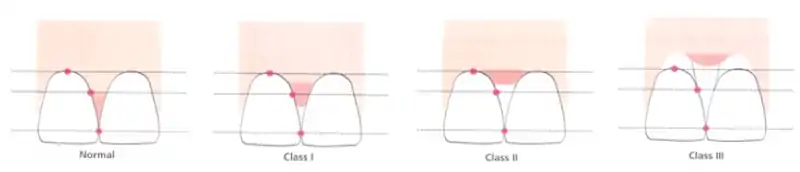 Dental floss is the most frequently recommended cleaning aid for teeth sides with a normal gingiva contour in which the spaces between teeth are tight and small.[15] The dental term ‘embrasure space’ describes the size of the triangular-shaped space immediately under the contact point of two teeth.[15] The size of the embrasure space is useful in selecting the most appropriate interdental cleaning aid. There are three interproximal embrasure types or classes as described below:[15]