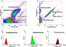 Analysis of a marine sample of photosynthetic picoplankton by flow cytometry showing three different populations (Prochlorococcus, Synechococcus, and picoeukaryotes)