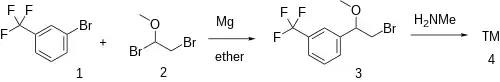 Grignard reaction between 3-Bromobenzotrifluoride [401-78-5] (1) and 1,2-dibromo-1-methoxyethane, CID:13226400 (2) leads to 1-(2-bromo-1-methoxyethyl)-3-(trifluoromethyl)benzene, CID:10589008 (3). The reaction with methylamine gives fludorex (4).