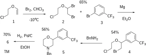 Ex 1: Halogenation of 2-chloro ethyl vinyl ether [110-75-8] (1) with molecular bromine gives 1,2-dibromo-1-(2-chloroethoxy)ethane [14689-94-2] (2). Grignard reaction with 3-bromobenzotrifluoride [401-78-5] (3) gives 1-[2-Bromo-1-(2-chloroethoxy)ethyl]-3-(trifluoromethyl)benzene, CID:12343529 (4).