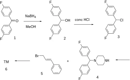 The 4,4'-Difluorobenzophenone [345-92-6] (1) is reduced with sodium borohydride giving bis(4-fluorophenyl)methanol (4,4'-difluorobenzhydrol) [365-24-2] (2). This is halogenated in concentrated muriatic acid giving 4,4'-Difluorobenzhydryl chloride [27064-94-4] (3). The alkylation of this with piperazine would give 1-(4,4'-Difluorobenzhydryl)piperazine [27469-60-9] (4). Alkylation of the remaining secondary nitrogen by cinnamyl chloride [2687-12-9] (5) completed the synthesis of Flunarizine (6). Alternatively, 3 can be alkylated by cinnamylpiperazine [18903-01-0] in a convergent method.