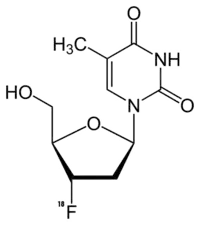 Fluorothymidine F-18 (FLT) is a tumor-specific PET tracer and radiopharmaceutical. It is an isotopologue of alovudine. FLT is suitable for monitoring how tumors respond to cytostatic therapy. FLT accumulates in proliferating cells where it indicates the activity of the enzyme thymidine kinase. Cell division can be characterized by the activity of that enzyme. FLT is phosphorylated as though it were thymidine, and is subsequently incorporated into DNA. Thymidine is essential for DNA replication. Considering that FLT lacks a 3′-hydroxy group, transcription of DNA is impeded following incorporating of FLT. FLT indicates changes in tumor cell proliferation by tracking the restoration of nucleosides from degenerated DNA.[1]