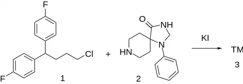 1,1'-(4-Chlorobutylidene)bis(4-fluorobenzene) [3312-04-7] (1) & 1-Phenyl-1,3,8-Triazaspiro[4.5]Decan-4-One [1021-25-6] (2) give Fluspiriline (3).