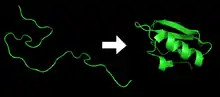 The simulations run on Folding@home are used in conjunction with laboratory experiments,[22] but researchers can use them to study how folding in vitro differs from folding in native cellular environments. This is advantageous in studying aspects of folding, misfolding, and their relationships to disease that are difficult to observe experimentally. For example, in 2011, Folding@home simulated protein folding inside a ribosomal exit tunnel, to help scientists better understand how natural confinement and crowding might influence the folding process.[40][41] Furthermore, scientists typically employ chemical denaturants to unfold proteins from their stable native state. It is not generally known how the denaturant affects the protein's refolding, and it is difficult to experimentally determine if these denatured states contain residual structures which may influence folding behavior. In 2010, Folding@home used GPUs to simulate the unfolded states of Protein L, and predicted its collapse rate in strong agreement with experimental results.[42]