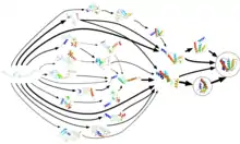 Protein folding does not occur in one step.[16] Instead, proteins spend most of their folding time, nearly 96% in some cases,[24] waiting in various intermediate conformational states, each a local thermodynamic free energy minimum in the protein's energy landscape. Through a process known as adaptive sampling, these conformations are used by Folding@home as starting points for a set of simulation trajectories. As the simulations discover more conformations, the trajectories are restarted from them, and a Markov state model (MSM) is gradually created from this cyclic process. MSMs are discrete-time master equation models which describe a biomolecule's conformational and energy landscape as a set of distinct structures and the short transitions between them. The adaptive sampling Markov state model method significantly increases the efficiency of simulation as it avoids computation inside the local energy minimum itself, and is amenable to distributed computing (including on GPUGRID) as it allows for the statistical aggregation of short, independent simulation trajectories.[25] The amount of time it takes to construct a Markov state model is inversely proportional to the number of parallel simulations run, i.e., the number of processors available. In other words, it achieves linear parallelization, leading to an approximately four orders of magnitude reduction in overall serial calculation time. A completed MSM may contain tens of thousands of sample states from the protein's phase space (all the conformations a protein can take on) and the transitions between them. The model illustrates folding events and pathways (i.e., routes) and researchers can later use kinetic clustering to view a coarse-grained representation of the otherwise highly detailed model. They can use these MSMs to reveal how proteins misfold and to quantitatively compare simulations with experiments.[7][22][26]
