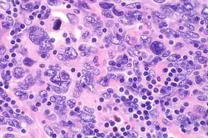 | Micrograph showing a follicular dendritic cell sarcoma. The cancer cells are larger and have pale staining nuclei. The smaller (benign) interspersed lymphocytes (darker blue) are common and suggest the diagnosis. H&E stain. | |