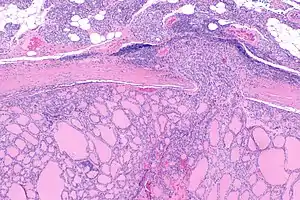 | Micrograph of follicular thyroid carcinoma showing a location where the cancer grows through the fibrous capsule. H&E stain. | |