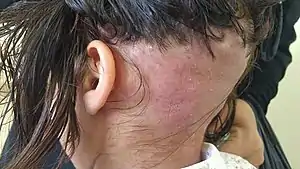 Folliculitis decalvans is an inflammation of the hair follicle that leads to bogginess or induration of involved parts of the scalp along with pustules, erosions, crusts, ulcers, and scale.[1]: 649 [2]: 760–1 It begins at a central point and spreads outward, leaving scarring, sores, and, due to the inflammation, hair loss in its wake.[3] No permanent cure has been found for this condition, but there is promise in a regimen of dual therapy with rifampin 300 mg twice daily and clindamycin 300 mg twice daily. This new treatment can be used to control the condition, and tests have indicated that after 3 to 5 months long uninterrupted courses of treatment, many patients have seen limited to no recurrence.[4]