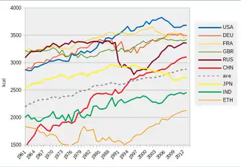 Food security can be measured by calories to digest out to intake per person per day, available on a household budget.[16][17] In general, the objective of food security indicators and measurements is to capture some or all of the main components of food security in terms of food availability, accessibility, and utilization/adequacy. While availability (production and supply) and utilization/adequacy (nutritional status/anthropometric measurement) are easier to estimate and therefore, more popular, accessibility (the ability to acquire a sufficient quantity and quality of food) remains largely elusive.[18] The factors influencing household food accessibility are often context-specific.[19]