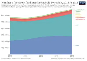 Recent editions of the SOFI report present evidence that the decades-long decline in hunger in the world, as measured by the number of undernourished (NoU), has ended. In the 2020 report, FAO used newly accessible data from China to revise the global NoU downwards to nearly 690 million, or 8.9 percent of the world population – but having recalculated the historic hunger series accordingly, it confirmed that the number of hungry people in the world, albeit lower than previously thought, had been slowly increasing since 2014. On broader measures, the SOFI report found that far more people suffered some form of food insecurity, with 3 billion or more unable to afford even the cheapest healthy diet.[29] Nearly 2.37 billion people did not have access to adequate food in 2020 – an increase of 320 million people compared to 2019.[30][31] FAO's 2021 edition of The State of Food and Agriculture (SOFA) further estimates that an additional 1 billion people (mostly in lower- and upper-middle-income countries) are at risk of not affording a healthy diet if a shock were to reduce their income by a third.[32]