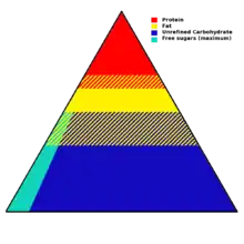 A food pyramid is a representation of the optimal number of servings to be eaten each day from each of the basic food groups.[2] The first pyramid was published in Sweden in 1974.[3][4][5] The 1992 pyramid introduced by the United States Department of Agriculture (USDA) was called the "Food Guide Pyramid" or "Eating Right Pyramid". It was updated in 2005 to "MyPyramid", and then it was replaced by "MyPlate" in 2011.[6][7]