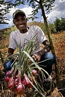A farmer holding up onions he has grown on his farm near Gilgil, Kenya