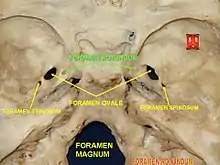 ![]() Base of the skull. Upper surface. Sphenoid is yellow, and arrows indicate the foramen rotundum.) | |