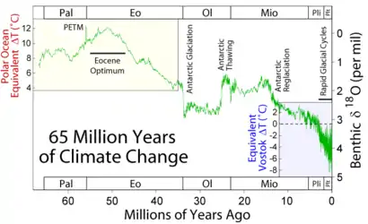 91. Zachos, J.C.; Pagani, M.; Sloan, L.; Thomas, E.; Billups, K. (2001). "Trends, Rhythms, and Aberrations in Global Climate, 65 Ma to Present" (PDF). Science. 292 (5517): 686–693. Bibcode:2001Sci...292..686Z. doi:10.1126/science.1059412. PMID 11326091. S2CID 2365991.