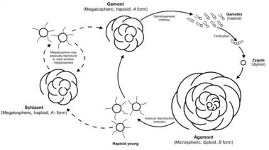 In some cases the haploid young may mature into a megalospheric form which then reproduces asexually to produce another megalospheric, haploid offspring. In this case, the first megalospheric form is referred to as the schizont or A1 form, while the second is referred to as the gamont or A2 form.