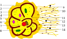 Schematic diagram of a live multilocular foraminifera. 1-endoplasm, 2-ectoplasm, 3-chamber, 4-pores, 5-foramen, 6-food vacuole, 7-nucleus, 8-mitochondria, 9-granureticulose pseudopodia, 10-granules, 11- primary aperture, 12-food particle, 13-Golgi apparatus, 14-ribosomes.