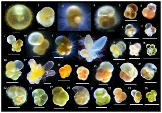 The generalized foraminiferal life-cycle involves an alternation between haploid and diploid generations, although they are mostly similar in form.[23][52] The haploid or gamont initially has a single nucleus, and divides to produce numerous gametes, which typically have two flagella. The diploid or agamont is multinucleate, and after meiosis divides to produce new gamonts. Multiple rounds of asexual reproduction between sexual generations are not uncommon in benthic forms.[34]
