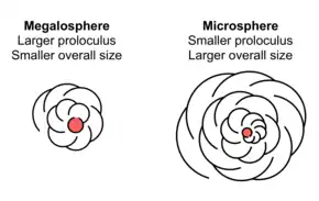 Morphs present in the foram life cycle—the megalosphere and the microsphere. The name derives from the size of the proloculus, or first chamber, and as such the microsphere has a larger overall size.