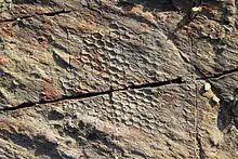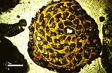 The mysterious vendozoans of the Ediacaran period have been suggested to represent fossil xenophyophores.[61] However, the discovery of diagenetically altered C27 sterols associated with the remains of Dickinsonia cast doubt on this identification and suggest it may instead be an animal.[62] Other researchers have suggested that the elusive trace fossil Paleodictyon and its relatives may represent a fossil xenophyophore[63] and noted the similarity of the extant xenophyophore Occultammina to the fossil;[64] however, modern examples of Paleodictyon have not been able to clear up the issue and the trace may alternately represent a burrow or a glass sponge.[65] Supporting this notion is the similar habitat of living xenophyophores to the inferred habitat of fossil graphoglyptids; however, the large size and regularity of many graphoglyptids as well as the apparent absence of xenophyae in their fossils casts doubt on the possibility.[64] As of 2017 no definite xenophyophore fossils have been found.[66]