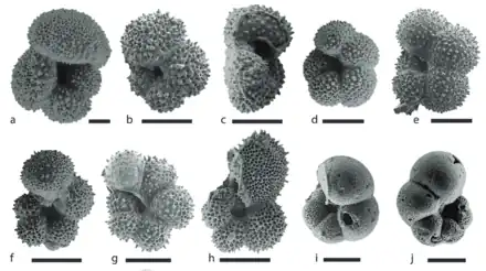 The majority of planktonic foraminifera are found in the globigerinina, a lineage within the rotaliida.[22] However, at least one other extant rotaliid lineage, Neogallitellia, seems to have independently evolved a planktonic lifestyle.[41][42] Further, it has been suggested that some Jurassic fossil foraminifera may have also independently evolved a planktonic lifestyle, and may be members of Robertinida.[43]