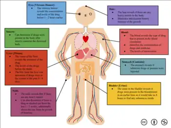 A urine sample is urine that has come from the bladder and can be provided or taken post-mortem. Urine is less likely to be infected with viruses such as HIV or Hepatitis B than blood samples.[9] Many drugs have a higher concentration and can remain for much longer in urine than blood. Collection of urine samples can be taken in a non-invasive way which does not require professionals for collection. Urine is used for qualitative analysis as it cannot give any indication of impairment due to the fact that drug presence in urine only indicates prior exposure.[10] Different drugs can also stay in your urine for different amounts of time. For example, alcohol will stay within your urine for 7–12 hours, cocaine metabolites will stay for 2–4 days, and morphine will stay for 48–74 hours. One drug that will stay in your urine for a varying amount of time (dependent on the usage and frequency) is marijuana. For a single use, it will stay for 3 days, moderate use (4 times per week) will stay for 5–7 days, daily use of the drug will cause it to stay for 10–15 days, and a long-term heavy smoker will have it stay within their urine for less than 30 days.[11]