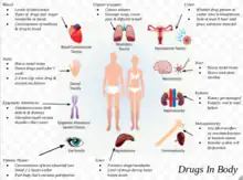 Determining the substance ingested is often complicated by the body's natural processes (see ADME), as it is rare for a chemical to remain in its original form once in the body. For example: heroin is almost immediately metabolised into another substance and further to morphine, making detailed investigation into factors such as injection marks and chemical purity necessary to confirm diagnosis.[5] The substance may also have been diluted by its dispersal through the body; while a pill or other regulated dose of a drug may have grams or milligrams of the active constituent, an individual sample under investigation may only contain micrograms or nanograms.