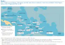 In October 2013, there was an outbreak of Zika fever in French Polynesia, the first outbreak of several Zika outbreaks across Oceania.[1] With 8,723 cases reported, it was the largest outbreak of Zika fever before the outbreak in the Americas that began in April 2015.[2] An earlier outbreak occurred on Yap Island in the Federated States of Micronesia in 2007, but it is thought that the 2013–2014 outbreak involved an independent introduction of the Zika virus from Southeast Asia.[3] Investigators suggested that the outbreaks of mosquito-borne diseases in the Pacific from 2012 to 2014 were "the early stages of a wave that will continue for several years",[1] particularly because of their vulnerability to infectious diseases stemming from isolation and immunologically naive populations.[1]