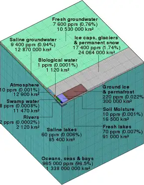 Visualisation of the distribution (by volume) of water on Earth.[lower-alpha 1]
