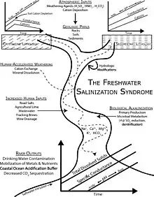 Freshwater salinization is the process of salty runoff contaminating freshwater ecosystems, which can harm aquatic species in certain quantities and contaminate drinking water.[1] It is often measured by the increased amount of dissolved minerals than what is considered usual for the area being observed.[2] Naturally occurring salinization is referred to as primary salinization; this includes rainfall, rock weathering, seawater intrusion, and aerosol deposits.[3] Human-induced salinization is termed as secondary salinization, with the use of de-icing road salts as the most common form of runoff.[4] Approximately 37% of the drainage in the United States has been effected by salinization in the past century.[1] The EPA has defined two thresholds for healthy salinity levels in freshwater ecosystems: 230 mg/L Cl− for average salinity levels and 860 mg/L Cl− for acute inputs.[5]