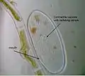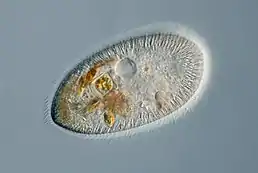 | Frontonia sp., specimen is digesting cyanobacteria, the mouth (cytostome) is at the bottom right. | |