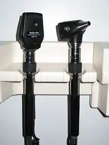 In 1915, Francis A. Welch and William Noah Allyn invented the world's first hand-held direct illuminating ophthalmoscope,[4] precursor to the device now used by clinicians around the world. This refinement and updating of von Helmholtz's invention enabled ophthalmoscopy to become one of the most ubiquitous medical screening techniques in the world today. The company Welch Allyn started as a result of this invention. In the 1970s a new ophthalmoloscope was developed with a larger primary lens allowing a 5x larger field-of-view, called the "Panoptic" or "pan ophthalmoscope".[5]
