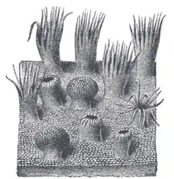 Semidiagrammatic view of a portion of the mucous membrane of the tongue. Two fungiform papillae are shown. On some of the filiform papillae the epithelial prolongations stand erect, in one they are spread out, and in three they are folded in.