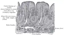 Foliate papillae are short vertical folds and are present on each side of the tongue.[2] They are located on the sides at the back of the tongue, just in front of the palatoglossal arch of the fauces,[4][2] There are four or five vertical folds,[2] and their size and shape is variable.[4] The foliate papillae appear as a series of red colored, leaf–like ridges of mucosa.[2] They are covered with epithelium, lack keratin and so are softer, and bear many taste buds.[2] They are usually bilaterally symmetrical. Sometimes they appear small and inconspicuous, and at other times they are prominent. Because their location is a high risk site for oral cancer, and their tendency to occasionally swell, they may be mistaken as tumors or inflammatory disease. Taste buds, the receptors of the gustatory sense, are scattered over the mucous membrane of their surface. Serous glands drain into the folds and clean the taste buds. Lingual tonsils are found immediately behind the foliate papillae and, when hyperplastic, cause a prominence of the papillae.