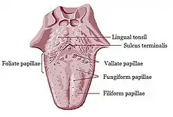 The circumvallate papillae (or vallate papillae) are dome-shaped structures on the human tongue that vary in number from 8 to 12. They are situated on the surface of the tongue immediately in front of the foramen cecum and sulcus terminalis, forming a row on either side; the two rows run backward and medially, and meet in the midline. Each papillae consists of a projection of mucous membrane from 1 to 2 mm. wide, attached to the bottom of a circular depression of the mucous membrane; the margin of the depression is elevated to form a wall (vallum), and between this and the papilla is a circular sulcus termed the fossa. The papilla is shaped like a truncated cone, the smaller end being directed downward and attached to the tongue, the broader part or base projecting a little above the surface of the tongue and being studded with numerous small secondary papillae and covered by stratified squamous epithelium. Ducts of lingual salivary glands, known as Von Ebner's glands empty a serous secretion into the base of the circular depression, which acts like a moat. The function of the secretion is presumed to flush materials from the base of circular depression to ensure that taste buds can respond to changing stimuli rapidly.[5] The circumvallate papillae get special afferent taste innervation from cranial nerve IX, the glossopharyngeal nerve, even though they are anterior to the sulcus terminalis. The rest of the anterior two-thirds of the tongue gets taste innervation from the chorda tympani of cranial nerve VII, distributed with the lingual nerve of cranial nerve V.