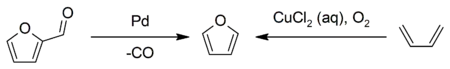 Industrially, furan is manufactured by the palladium-catalyzed decarbonylation of furfural, or by the copper-catalyzed oxidation of 1,3-butadiene:[4]