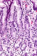 In anatomy, the G cell or gastrin cell, is a type of cell in the stomach and duodenum that secretes gastrin. It works in conjunction with gastric chief cells and parietal cells. G cells are found deep within the pyloric glands of the stomach antrum, and occasionally in the pancreas[1] and duodenum. The vagus nerve innervates the G cells. Gastrin-releasing peptide is released by the post-ganglionic fibers of the vagus nerve onto G cells during parasympathetic stimulation. The peptide hormone bombesin also stimulates gastrin from G cells. Gastrin-releasing peptide, as well as the presence of amino acids in the stomach, stimulates the release of gastrin from the G cells. Gastrin stimulates enterochromaffin-like cells to secrete histamine.[2] Gastrin also targets parietal cells by increasing the amount of histamine and the direct stimulation by gastrin, causing the parietal cells to increase HCl secretion in the stomach. G-cells frequently express PD-L1 during homeostasis which protects them from Helicobacter pylori-induced immune destruction [3]